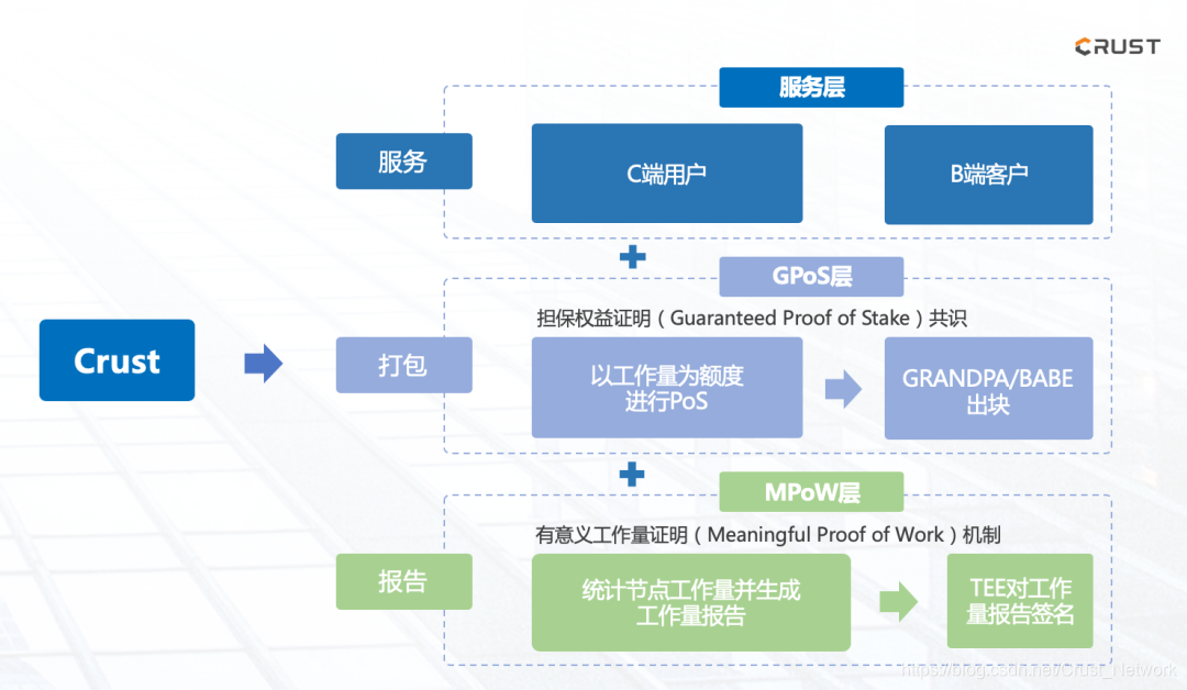 Crust 基于 TEE 可信执行环境技术,提出了 MPoW(Meaningful Proof of Work),即有意义的工作量证明机制。 Crust 存储节点会周期地向全网报告“我”提供了多少存储空间、“我”存了哪些用户文件等信息,在 MPOW 机制帮助下,报告中的工作量是可验证并且可信的;并把工作量报告连同其它交易一起记录并打包到区块中。