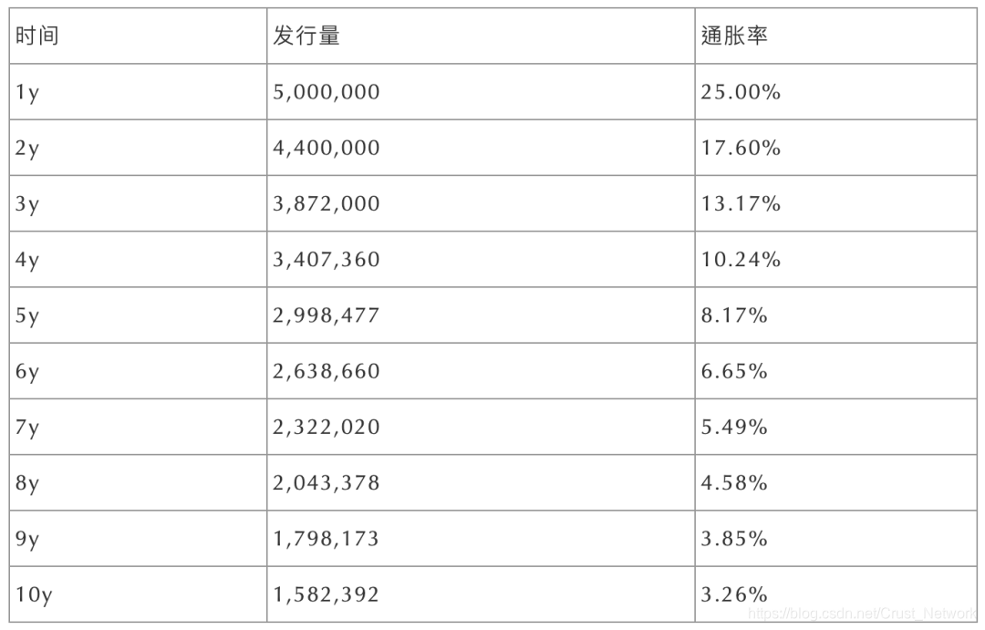从第二年开始每年发行总量为上一年的 88%,直到全网通胀率达到 2.8% 时不再减少。