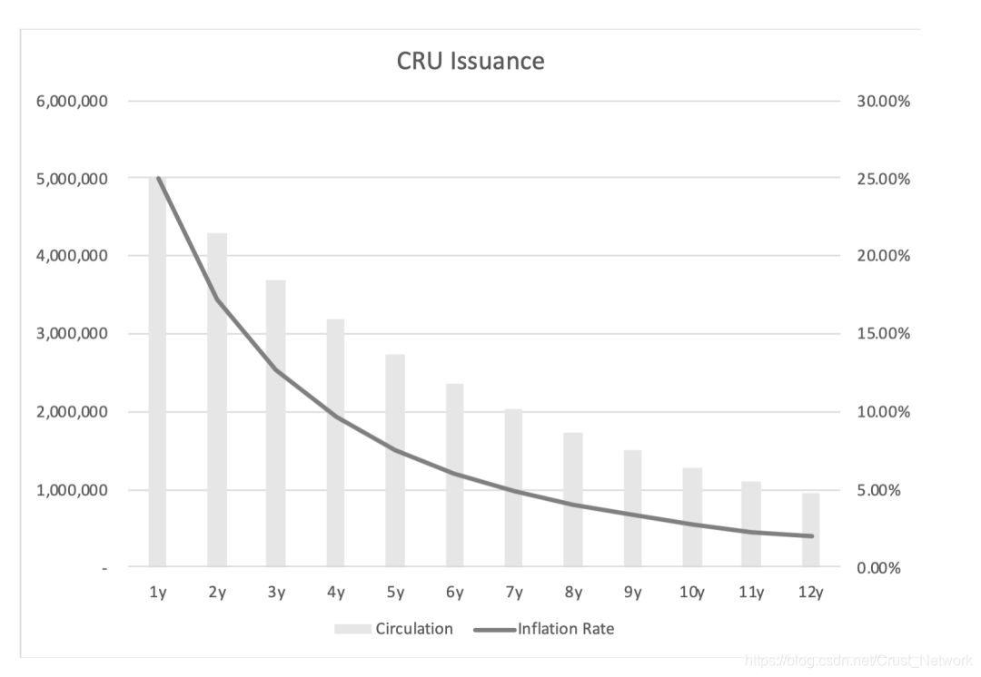 CRU通证的产生方式有两种:一种是主网启动时一次性产生;另一种是随着区块的生成而产生。