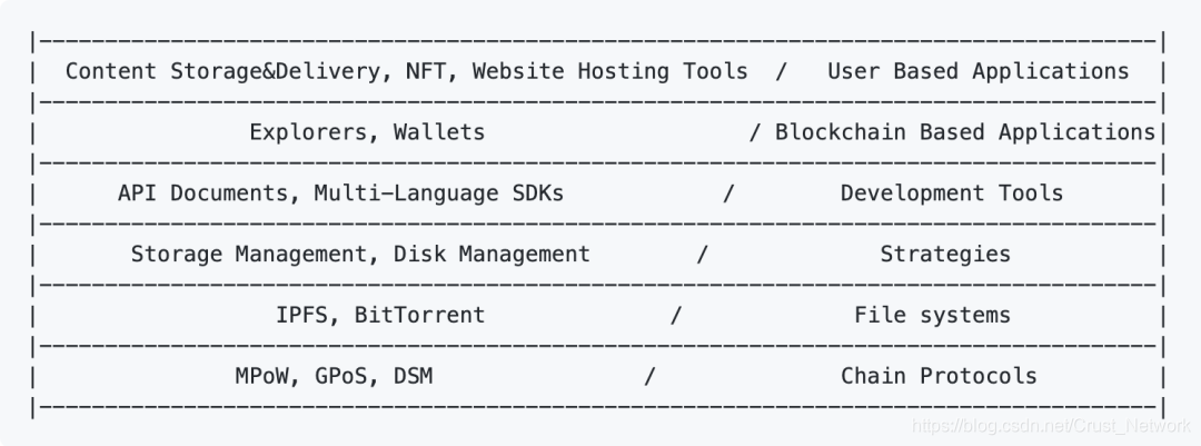 从功能和技术上看,Crust 在 Web3 协议栈的定位,是属于“Data Distribution Protocols” ,Crust 存储层协议有能力提供上层协议需要的加密存储以及大运算量计算的支持。 Crust 的上层设计包含存储市场、检索市场、文件管理等机制,天然的需要兼容一些去中心化的数据传输协议、应用以及金融系统,而这些协议和应用都在 Web3 生态中已经有了较为完备的实现。 比如一些 Web3 生态的文件协议如 DAT、Shift 等,可以提供灵活的文件管理功能,并更好的支持了动态文件的版本控制,但都需要 Crust 这样的存储激励层来提供最基本的存储资源。